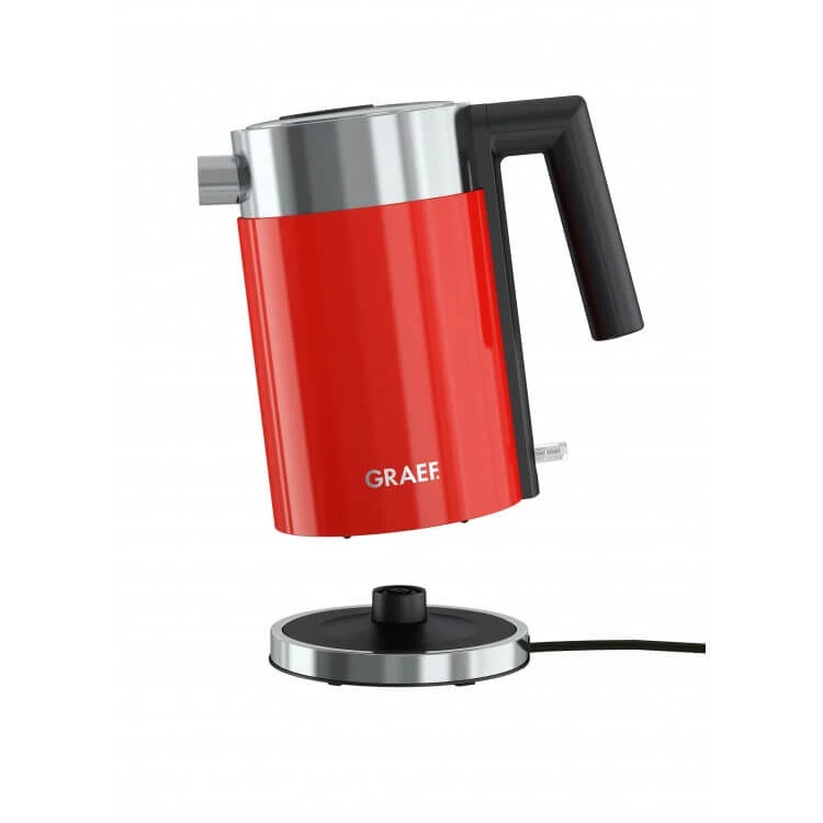 De glanzend rode Graef waterkoker heeft een inhoud van 1 liter en is gemakkelijk met een hand te bedienen. De ketel is snoerloos en 360 graden draaibaar op het basisstation. De koker tijdelijk niet in gebruik? Het snoer is gemakkelijk op de bergen in de bodem.