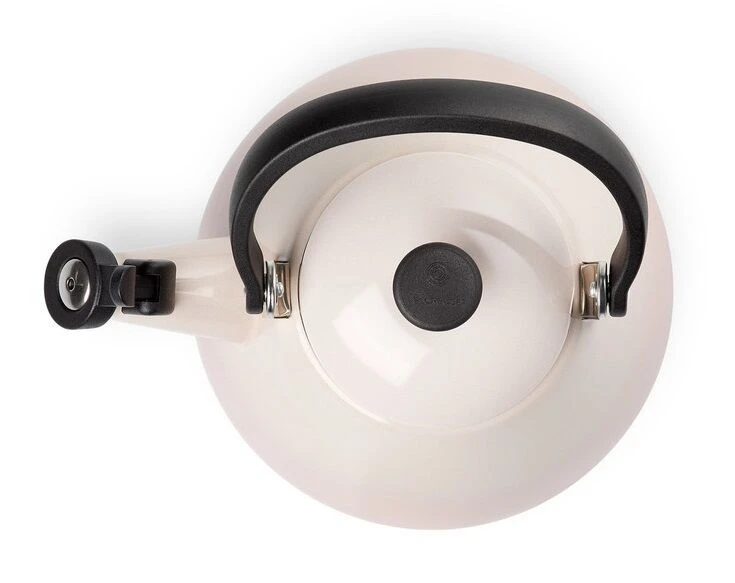 De plaatstalen Le Creuset Kone fluitketel heeft een geïntegreerde fluit die gemakkelijk is op te klappen om het hete water uit te schenken. De Kone heeft een moderne conische vormgeving. De handgreep en knoppen zijn van kunststof voor een koele grip.