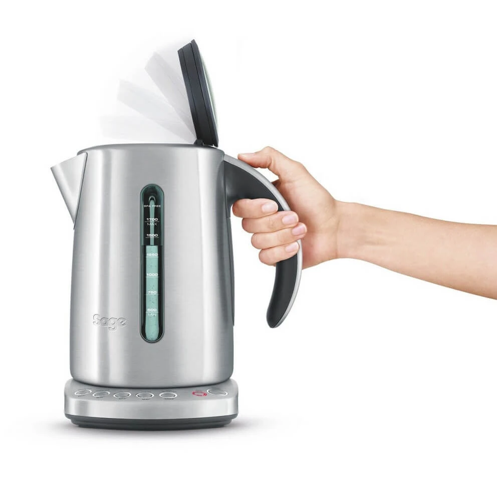 De Sage The Smart Kettle waterkoker is gemaakt van geborsteld roestvrij staal en heeft een inhoud van 1,7 liter. Met de Sage waterkoker bereidt u thee en houdt u deze tot wel 20 minuten in de ideale omstandigheden op temperatuur. The Smart Kettle heeft 5 verschillende temperatuurinstellingen geschikt voor groene, witte en zwarte thee, oolong en cafetièrekoffie. De waterkoker heeft de volgende afmetingen: 18,5 x 18,3 x 24,6 cm.